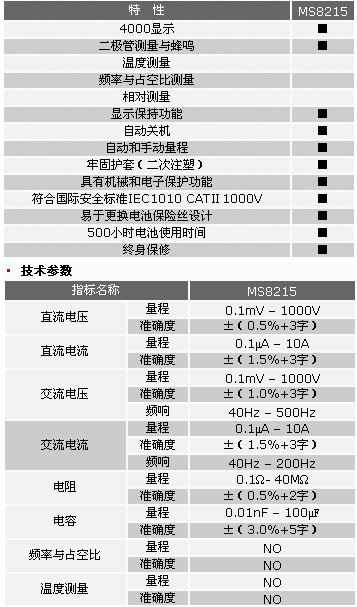 · MS8215 數字萬用表系列更注重儀表操作者的人身安全性,不僅具有電子和機械雙重保護,而且輸入量程和功能的保護可高達1000V(電流量程保護為600V)。