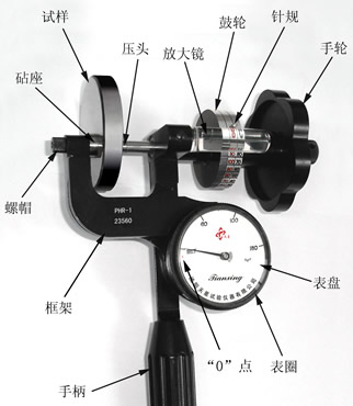 本儀器的設(shè)計(jì)符合洛氏硬度試驗(yàn)的基本定義。與臺(tái)式機(jī)的主要不同點(diǎn)是:其試驗(yàn)力的施加是通過(guò)螺桿和一個(gè)已校準(zhǔn)的彈簧完成的;用刻度表測(cè)量彈簧位移來(lái)確定試驗(yàn)力的大?。粔汉凵疃鹊臏y(cè)量由精密螺旋測(cè)微機(jī)構(gòu)完成,硬度值的讀取方式是透過(guò)放大鏡讀取鼓輪上的刻度線。本儀器的結(jié)構(gòu)如上圖所示