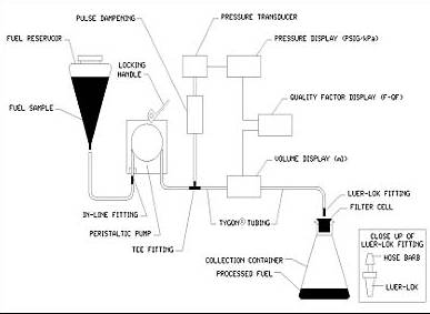 試樣以一定的速率(20 mL/min)通過標(biāo)準(zhǔn)多孔過濾器,同時測定通過過濾器的壓降和濾液體積。當(dāng)通過過濾器的壓降超過105 kPa (15 psi)或已過濾300 mL試樣時,測試即可結(jié)束,并顯示最終壓力和體積。使用最終壓力和體積,可以計算得出第三個實(shí)驗結(jié)果——過濾品質(zhì)因子(F-QF)——并數(shù)字顯示該結(jié)果。F-QF數(shù)值從0到100,數(shù)值越高表示微粒污染物越少。