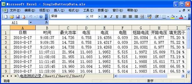 - 可自動測量出:最大輸出功率Pmax;最大功率時的電流值Ipmax,電壓值Vpmax,電阻值Rpmax;短路電流Ishort;開路電壓Vopen;填充因子FF;電池的串聯電阻Rs以及并聯電阻Rsh。